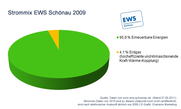Die Zahlen für 2010 haben die EWS noch nicht veröffentlicht (Stand 27.09.2011). Wir haben telefonisch nachgefragt und es wurde uns bestätigt, dass es selbstverständlich auch 2010 im EWS Strommix keinerlei Atomstrom und auch kein Strom aus Kohle oder Öl gab. Der Erdgas-Anteil stammt aus klimaschonender und hocheffizienter Kraft-Wärme-Kopplung aus kommunalen Anlagen. Das Erdgas liefert nicht nur Strom, sondern gleichzeitig auch Wärme zum Heizen und damit einen doppelten Energie-Nutzen. Mit dieser Lösung stellen die EWS sicher, dass zu keinem Zeitpunkt Atomstrom oder Strom aus Kohle oder Öl hinzugekauft werden muss.